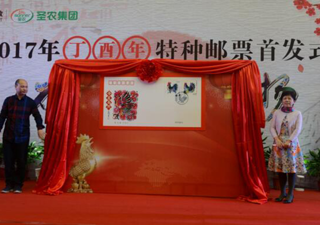 揭幕仪式由光泽县人民政府、圣农携手中国邮政集团公司光泽县分公司联合主办,常务副总裁陈榕为首日封揭幕,并在首发式上讲了话,她说邮票被誉为国家名片,是特殊的文化传播媒介,而生肖是产生于我国的一种古老民俗文化现象。鸡在中国十二生肖中排名第十,代表着诚信,象征着吉祥。特种邮票的发行,将有利于树立圣农企业新形象,促进企业文化建设的提升,打造出企业对外交流的新载体。