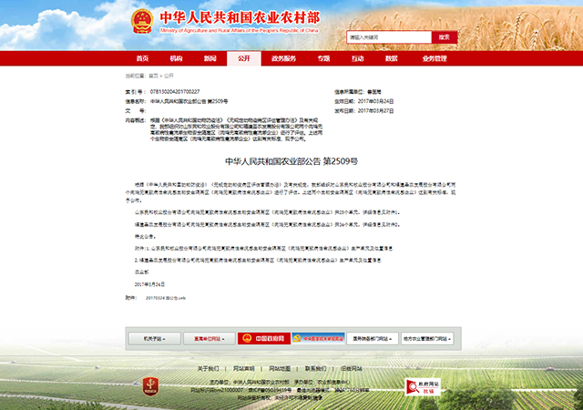 2017年3月24日,中华人民共和国农业部发布第2509公告,正式宣布福建圣农发展股份有限公司通过了共和国农业部肉鸡无高致病性禽流感隔离区验收评估。权威证实,圣农发展下设的肉鸡无高致病性禽流感生物安全隔离区达到了国家相关标准。
